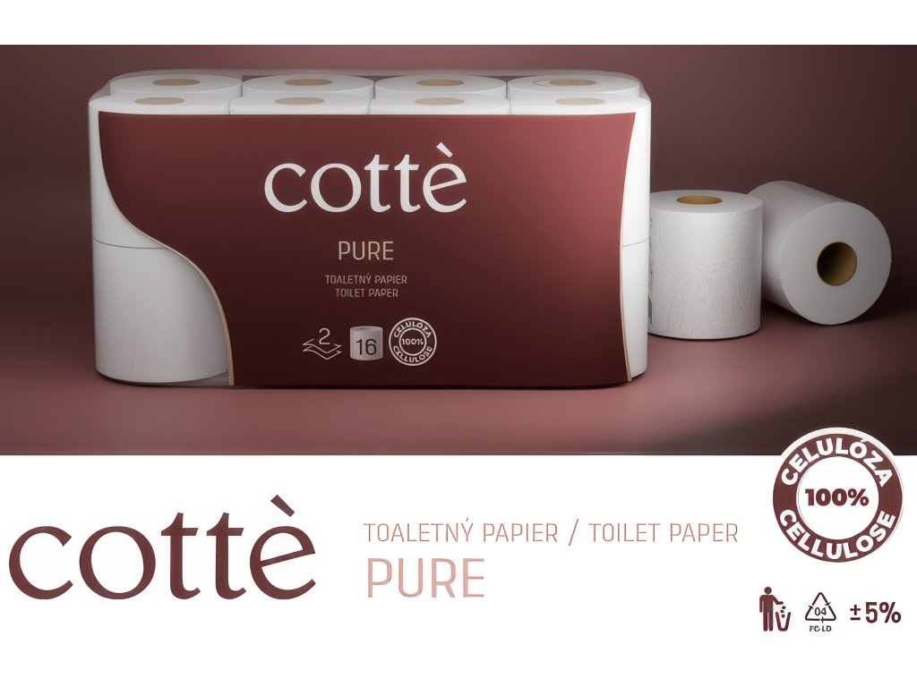 Cotté Pure je prémiový 2-vrstvový toaletný papier vyrobený zo 100 % čistej celulózy najvyššej belosti, pochádzajúcej z trvalo udržateľných lesov. Každá rolka je dôkazom toho, že komfort a ekologická zodpovednosť môžu ísť ruka v ruke.