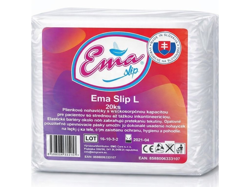 Zaistite si istotu a pohodlie s Ema Slip L zalepovacími plienkovými absorpčnými nohavičkami. Pre spoľahlivú ochranu.