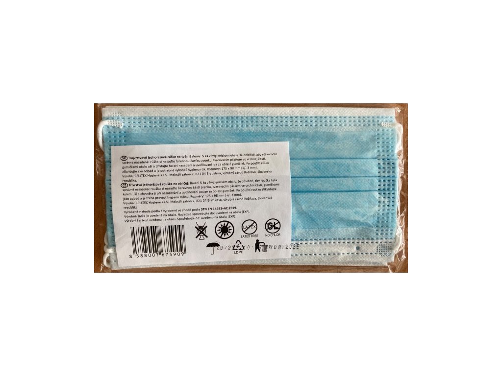 Ochranné rúško jednorazové 3-vrstvové 5ks (200bal/kar)