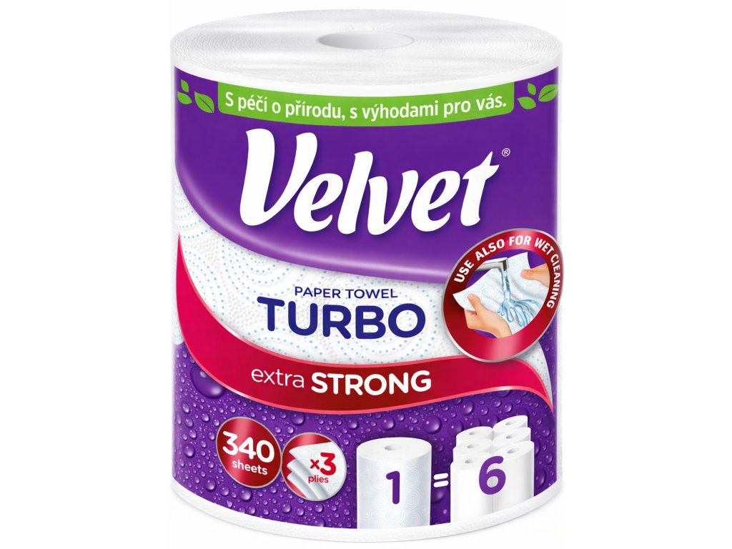 Papierová utierka Velvet Turbo ponúka vysokú savosť, pevnosť a dlhú výdrž. Tri vrstvy jemného bieleho papiera rýchlo absorbujú vlhkosť a účinne čistia povrchy v kuchyni aj celej domácnosti. Je bezpečná pri kontakte s potravinami, takže je ideálna na pracovné dosky, skrinky či bežné upratovanie.